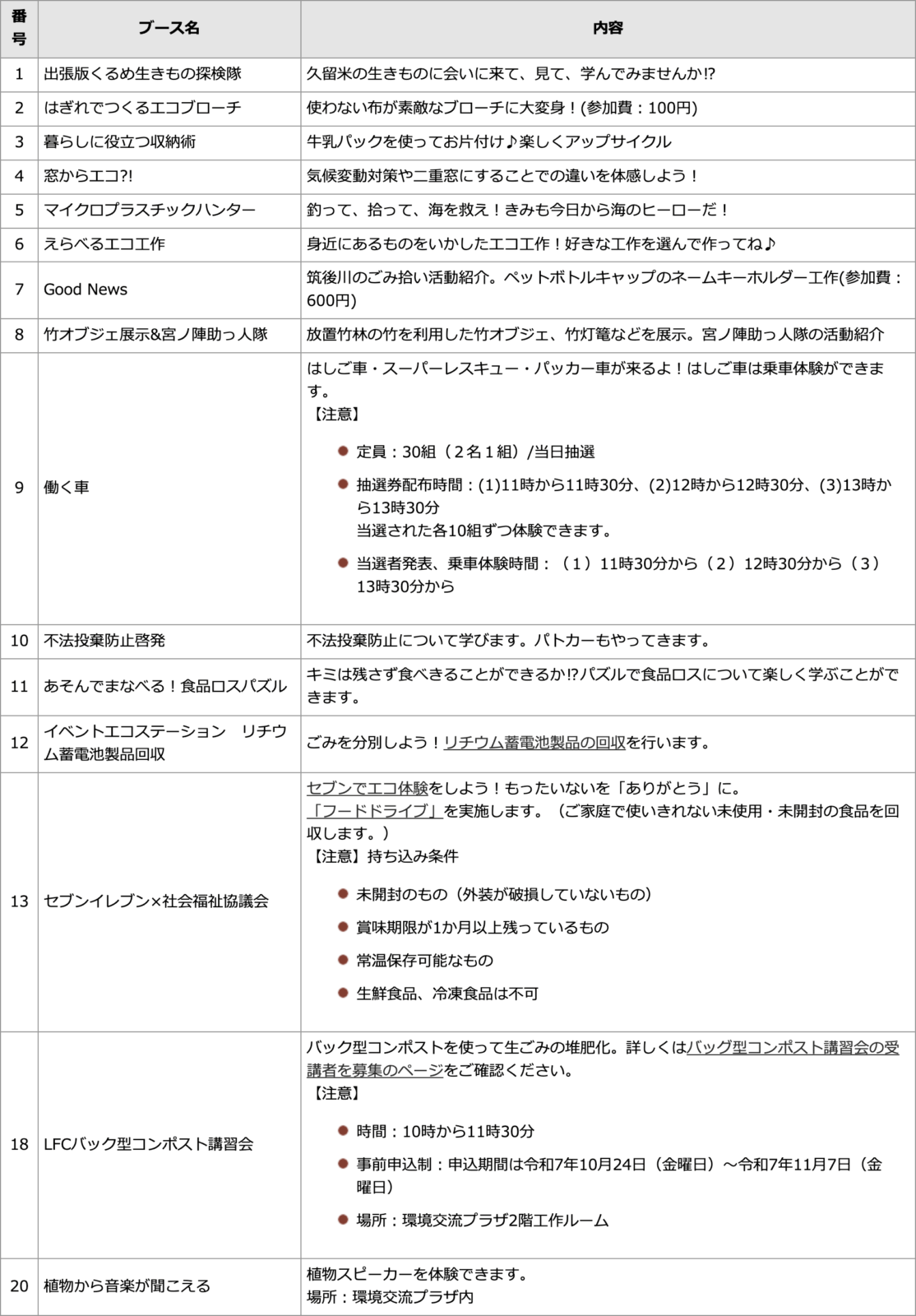 日 時:令和7年11月23日(日曜日)11時~15時 雨天時は環境交流プラザ内で実施