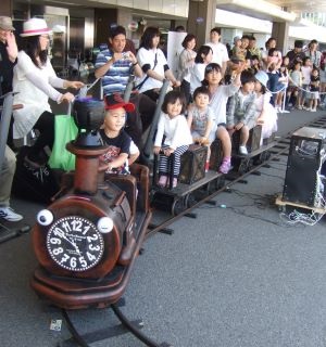 人力発電のミニSLが会場に!?バイクで発電した電気で走る汽車に乗車しよう!