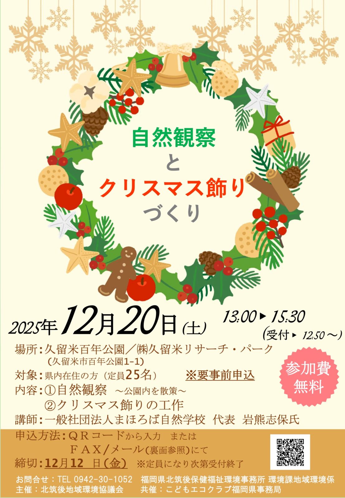 北筑後地域環境協議会主催の自然共生イベント「自然観察とクリスマス飾りづくり」を、12月20日(土)に実施します。