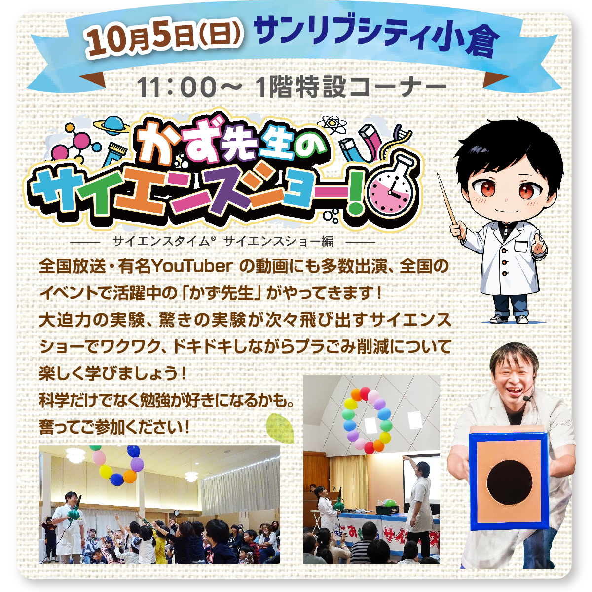 全国のイベントで活躍中の「かず先生」によるサイエンスショーのほか、ワークショップやパネル展示などを通してプラスチックごみの削減について楽しく学べるイベントです。