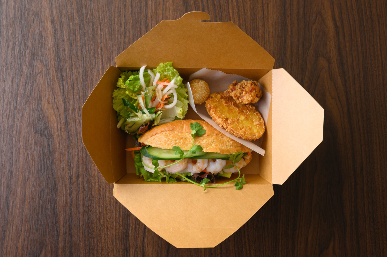 コロナ禍以降にテイクアウトが増えて、テイクアウト容器をたくさん使うようになりました。それまでのテイクアウト容器も、できればエコなものをとバイオプラスチック(※)容器を使っていましたが、値段が高くて…。容器代はお客様からいただいていないので、数が増えると負担が大きくなってしまいます。もっと安くていい容器はないか探してみたものの、バインミー自体がちょっと大きい上に、バインミーとサイドメニュー2品が付いたセットメニューが人気で、テイクアウトとなるとなかなか入る容器が見つかりませんでした。